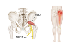 이상근은 골반 안쪽의 뼈(천골)과 허벅지 뼈를 이어주는 근육이며, 이상근과 골반 뼈 사이에는 척추에서 다리로 가는 좌골신경이 있습니다. 이상근이 과도하게 비대해지거나 긴장하게 되면 좌골 신경을 압박해 엉덩이 뒤쪽과 다리 부위에 통증, 저림, 당김, 이상 감각 등을 초래할 수 있습니다. 허리디스크와 증상이 유사하지만, 원인 발생 부위가 달라 정확한 진단 후 치료가 필요합니다.