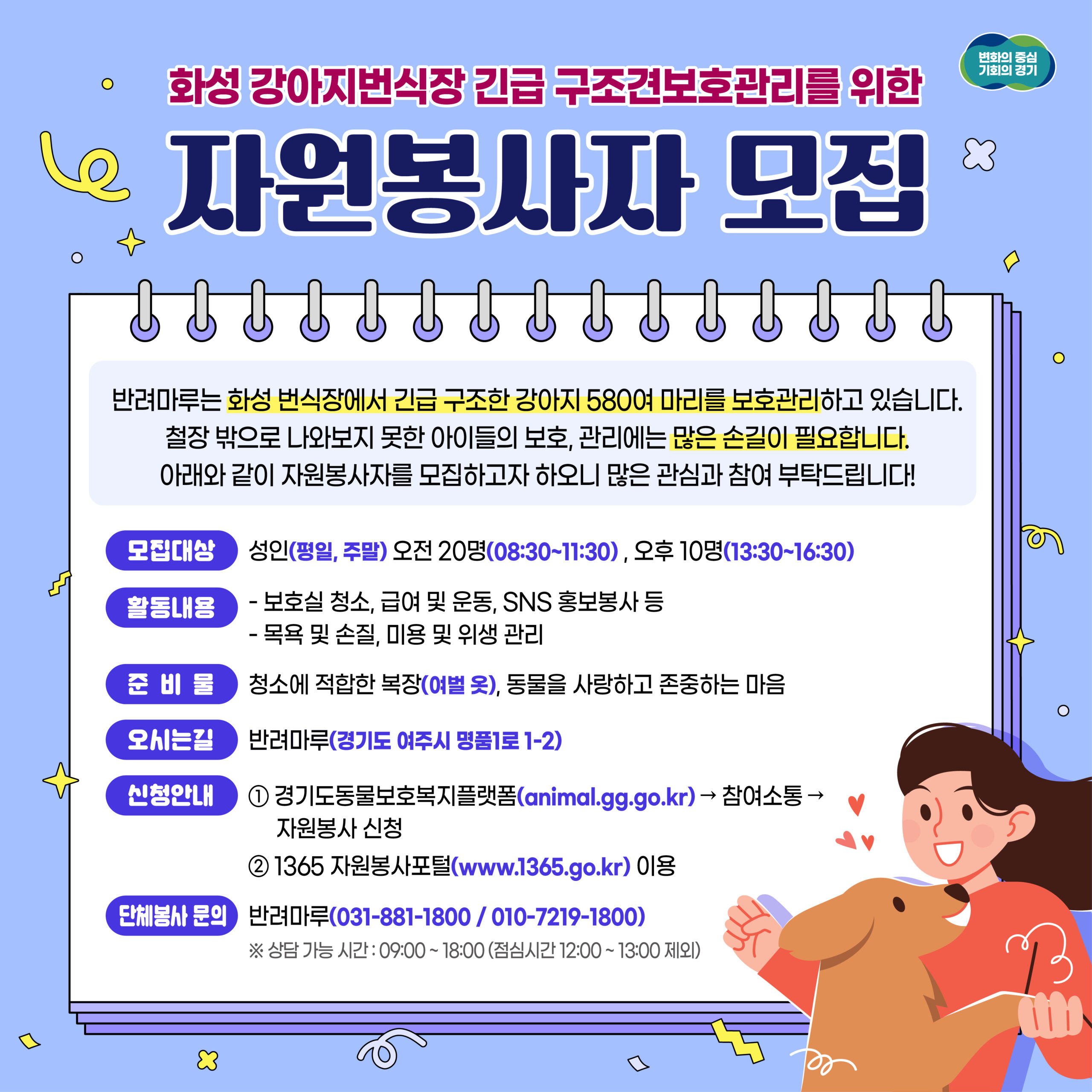 자원봉사를 희망하는 사람은 경기도동물보호복지플랫폼(animal.gg.go.kr) 또는 1365 자원봉사포털(www.1365.go.kr)에서 신청하면 된다. 자세한 내용은 반려마루(031-881-1800, 010-7219-1800)으로 문의하면 된다.